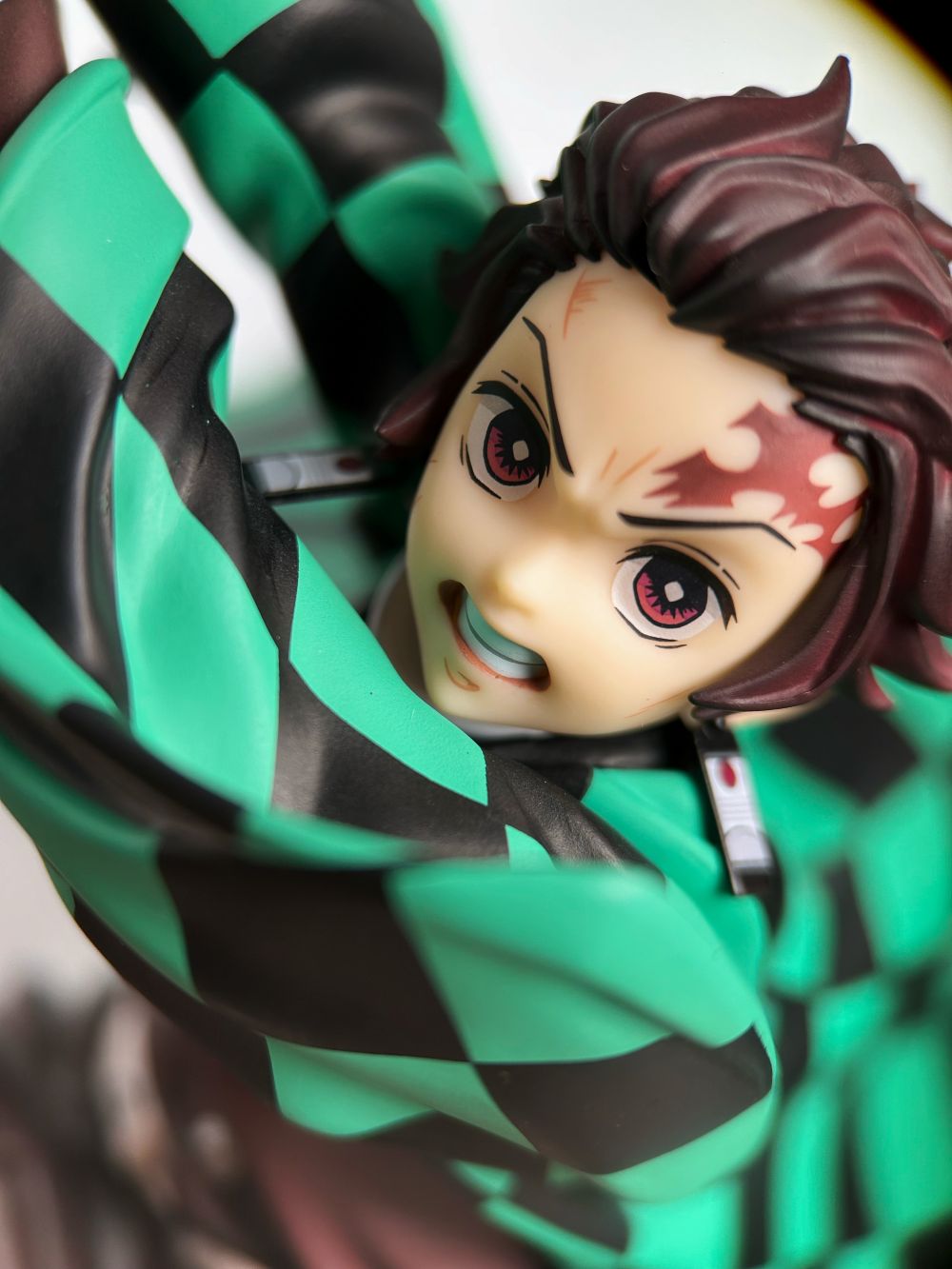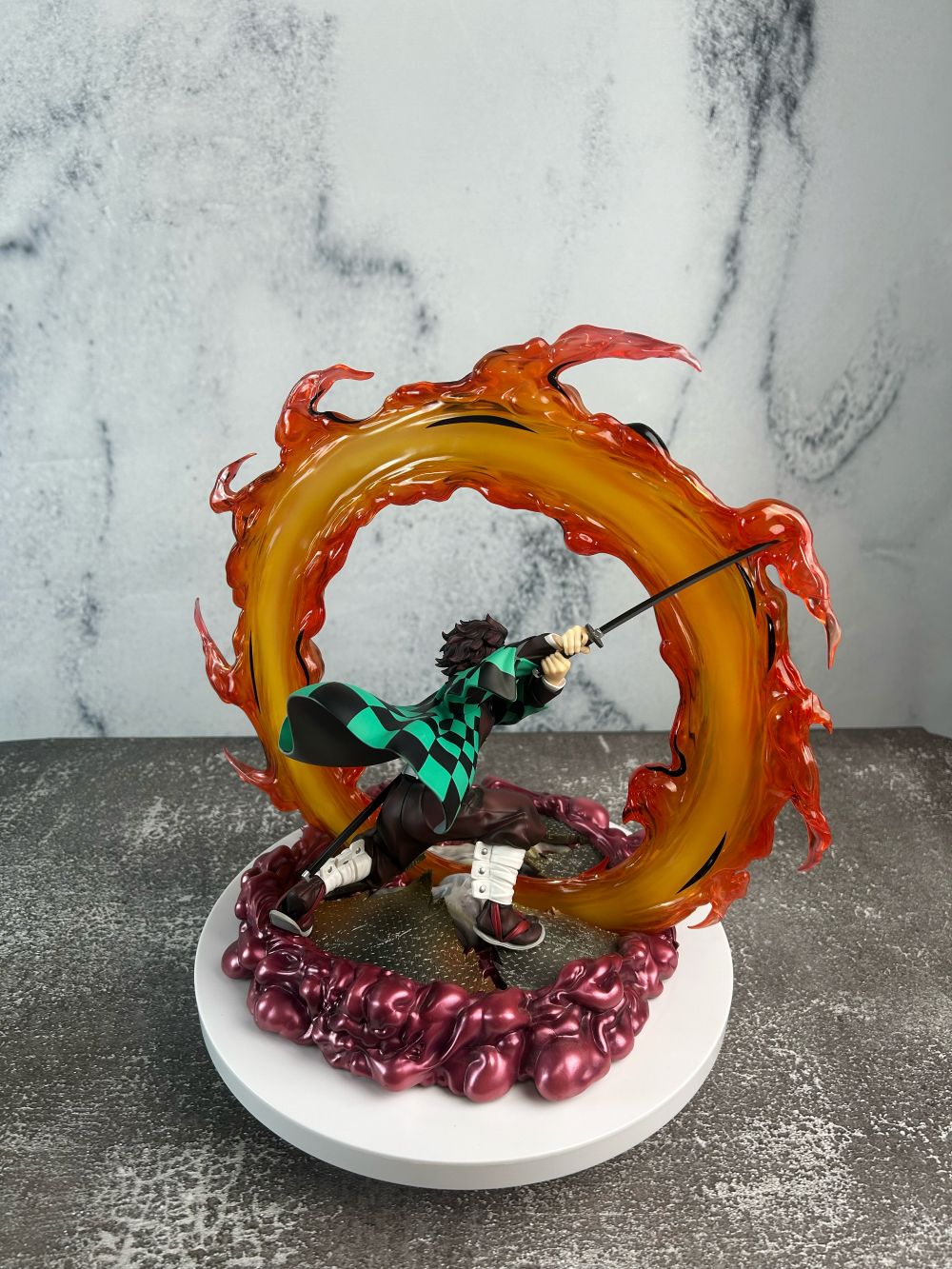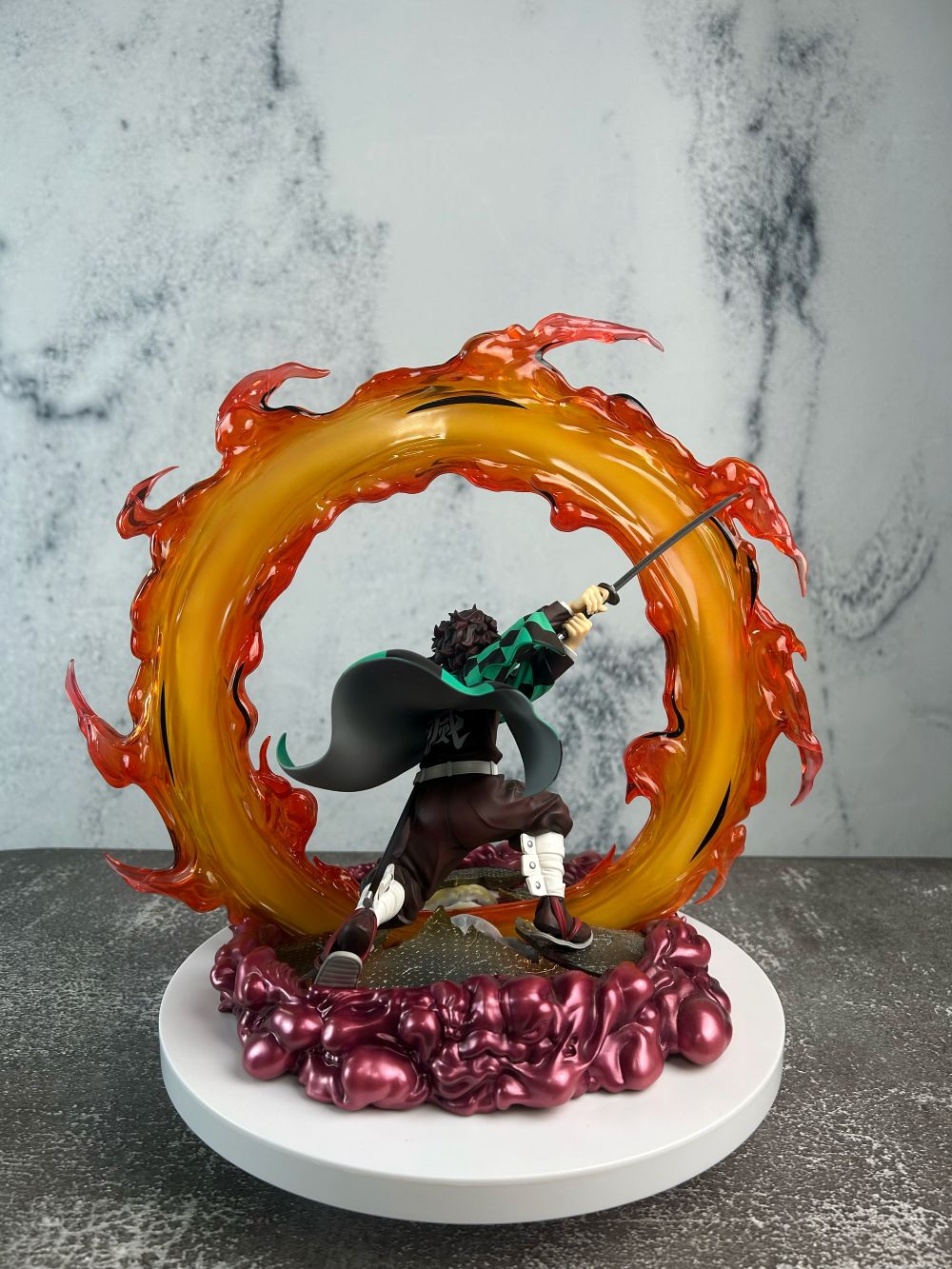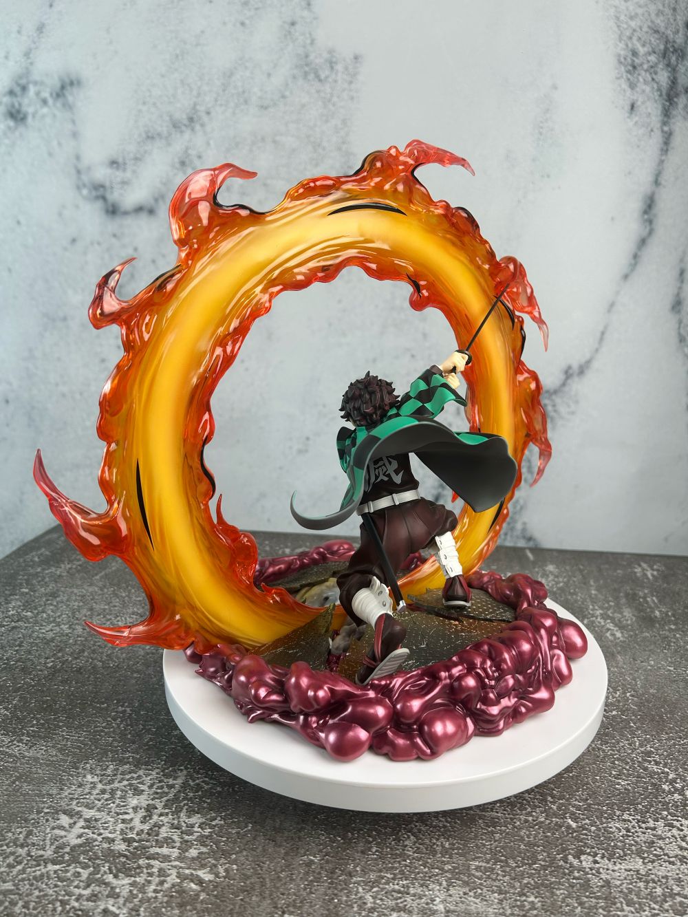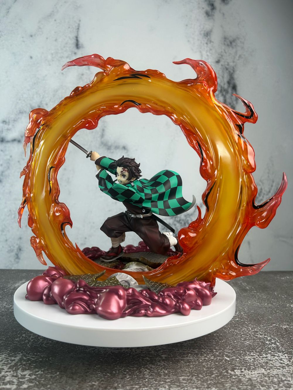 Tư thế Tanjiro thi triển tuyệt kỹ “Hinokami Kagura: Hekira no Ten” được tái hiện sống động, kết hợp cùng hiệu ứng lửa nhựa trong suốt uốn quanh toàn thân, tạo nên cảm giác chuyển động mãnh liệt và chân thực.