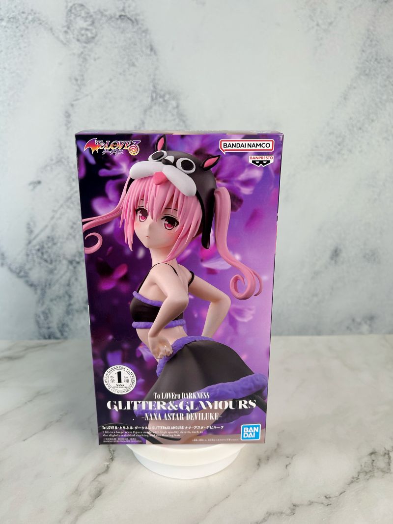 Nana Astar Deviluke – Glitter & Glamours – To LOVEru Darkness (Banpresto) nổi bật với tạo hình váy tối màu pha tím cá tính, pose quay lưng khoe đường cong táo bạo cùng biểu cảm tinh nghịch đặc trưng của Nana. Form dáng gợi cảm đúng chất Glitter & Glamours, rất hợp trưng bày chung Momo hoặc Nemesis để tạo bộ Deviluke đối lập nhưng hút mắt.