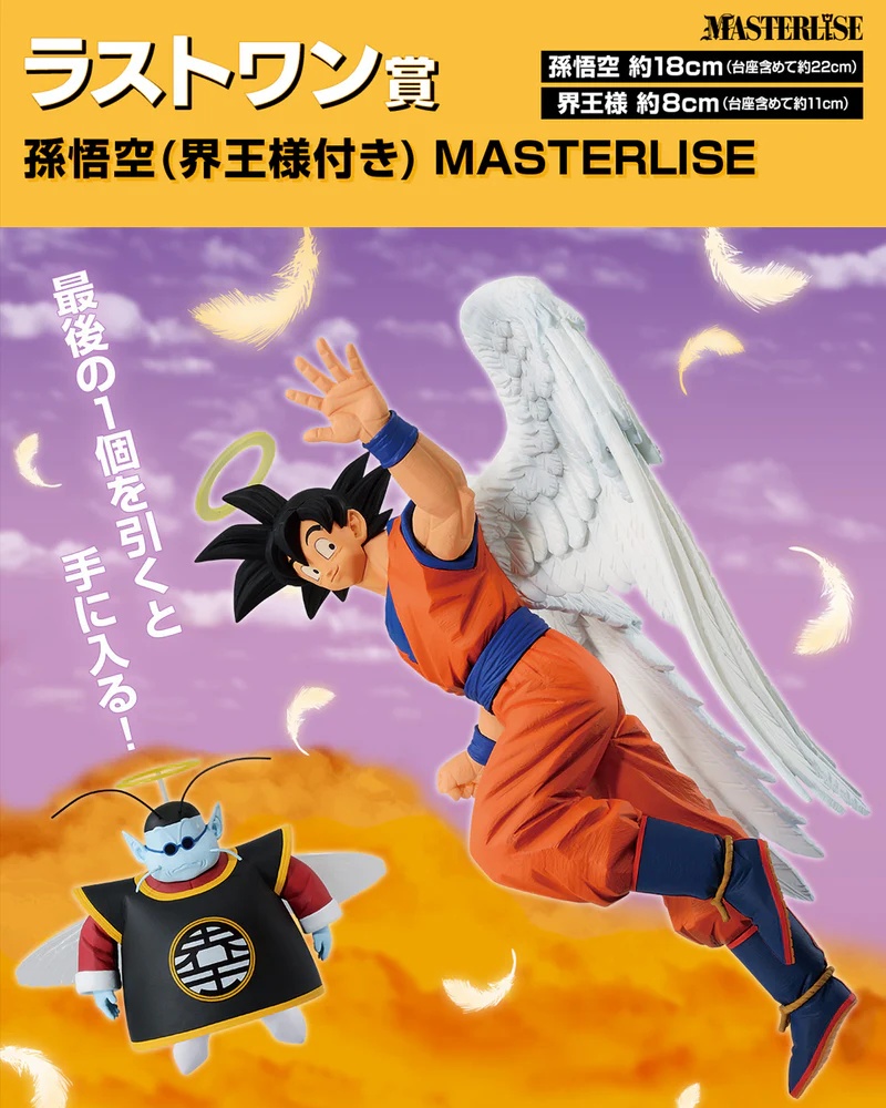 Son Goku & King Kai/Kaio -Duel to future -MASTERLISE -Ichiban Kuji Last One là phiên bản đặc biệt dành cho người rút trúng giải cuối cùng trong series Ichiban Kuji Dragon Ball Z. Mô hình tái hiện khoảnh khắc Goku với vòng hào quang và đôi cánh thiên sứ, đang bay cùng Kaiō-sama — một phân cảnh đầy cảm xúc gắn liền với hành trình sau khi Goku hy sinh. Từng chi tiết đều được Bandai Namco chế tác tỉ mỉ theo chuẩn dòng MASTERLISE, mang đến vẻ sống động và cảm xúc chân thật. Đây là món sưu tầm hiếm và cực kỳ giá trị dành cho fan Dragon Ball.