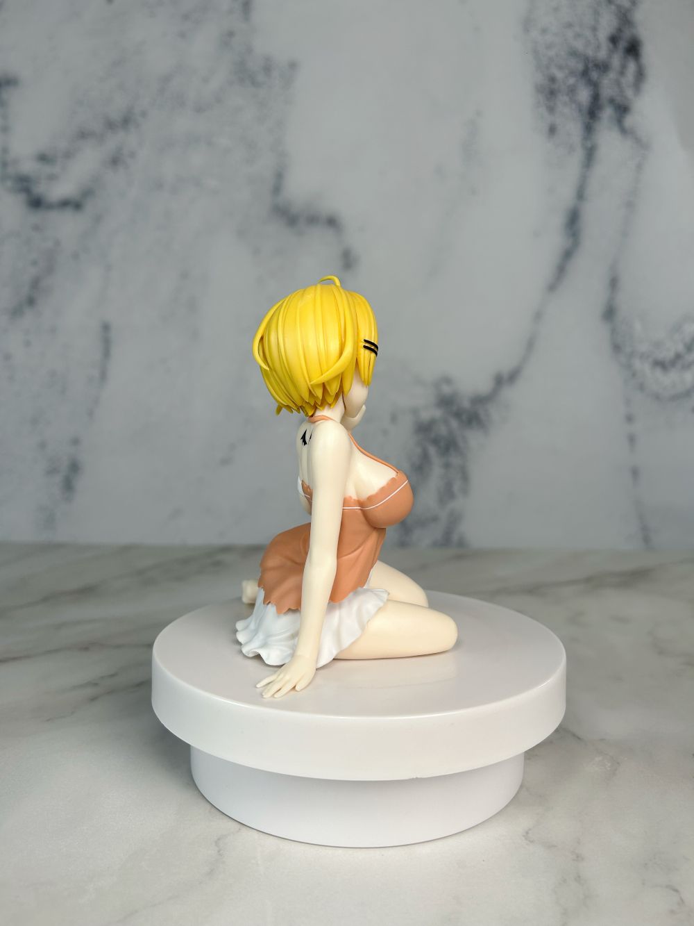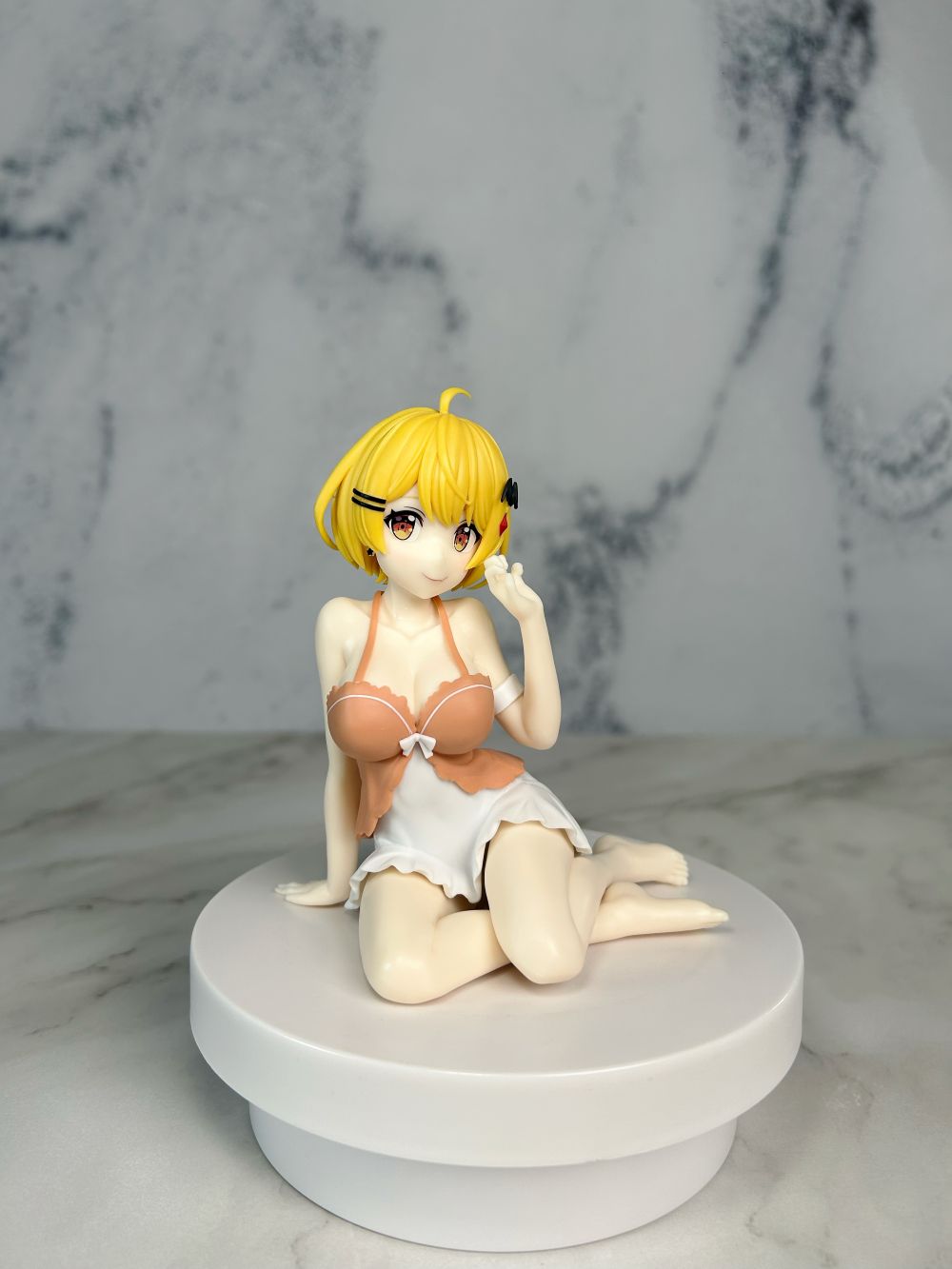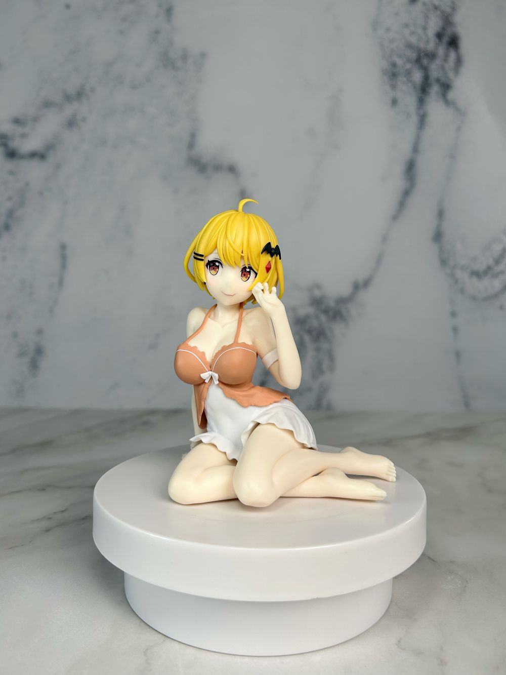Trang phục đồ ngủ pastel với phần áo cam nhạt và váy trắng mềm rũ tạo nên vibe thư giãn đặc trưng của dòng Relax time của Banpresto. Tư thế ngồi quỳ kèm gesture tạo dáng tay đáng yêu khiến Yozora Mel trông gần gũi và sống động, rất hợp khi trưng trong bộ sưu tập Hololive.